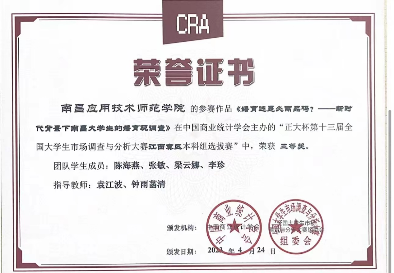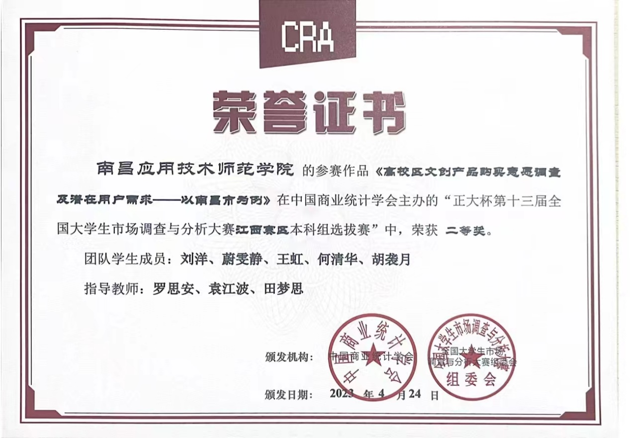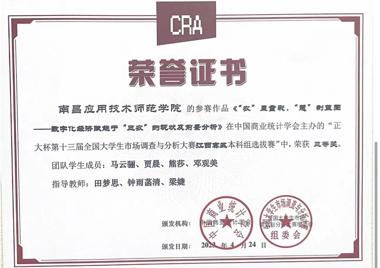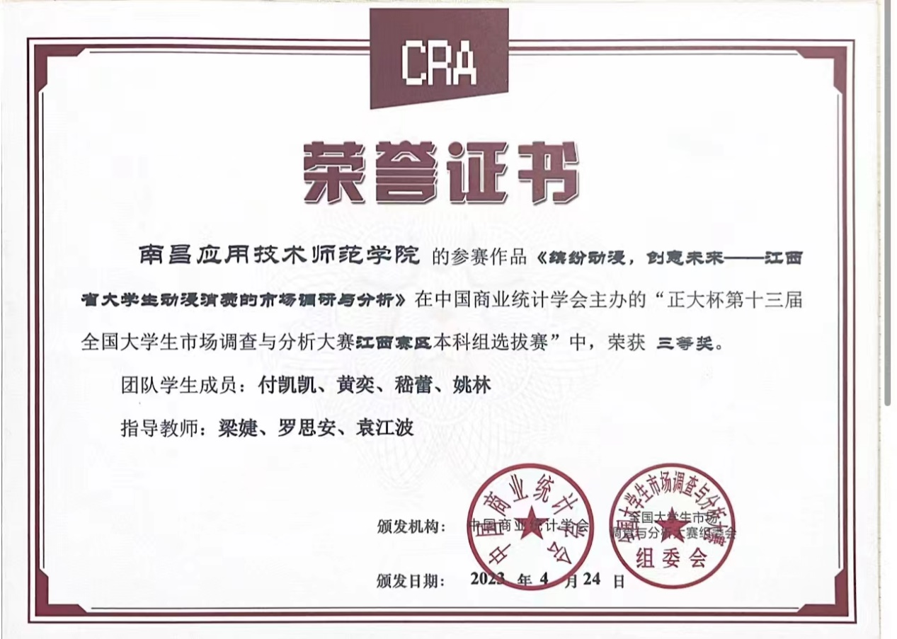 近日,由中国商业统计学会主办的“正大杯第十三届全国大学生市场调查与分析大赛”,江西赛区本科组已公布比赛结果,我校beat365唯一官网罗思安、袁江波、田梦思、梁婕和钟雨菡清老师指导的学生参赛作品获得比赛二等奖1项,三等奖3项。