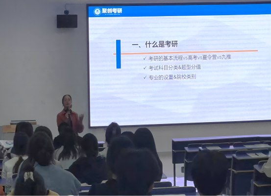 首先,刘艳艳老师以什么是考研开始引入讲座的主题,并在有趣的互动中了解大家对考研的认识和大家的考研方向。她指出在当前分数线上涨,竞争激烈的时代背景下,同学们需要提升自己的能力,并明确指出考研的真正意义是走上一个更高更远的平台,为更好的发展打好基础。同时详细介绍了考研常识及流程步骤、考研五大阶段学习备考指导和院校专业“避坑”及跨考方向推荐。