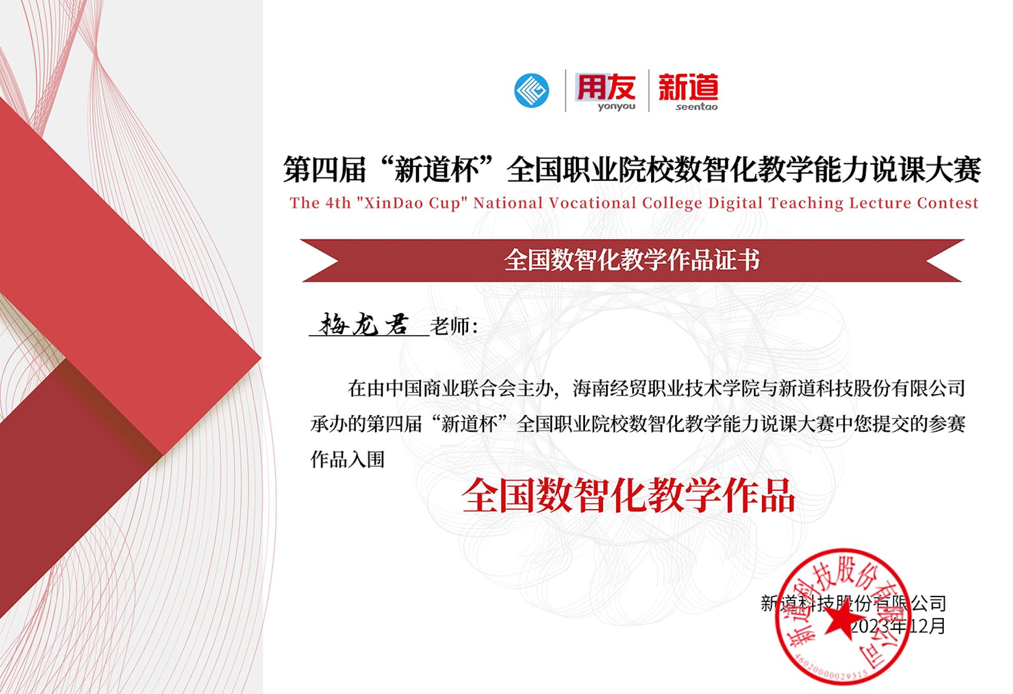 由中国商业联合会主办,用友新道科技股份有限公司和海南经贸职业技术学院承办的第四届“新道杯”全国职业院校数智化教学能力说课大赛经过紧张的评审,最终确定了20名全国优秀的参赛教师晋级本届大赛的线下全国总决赛。beat365教师梅龙君位列其中!