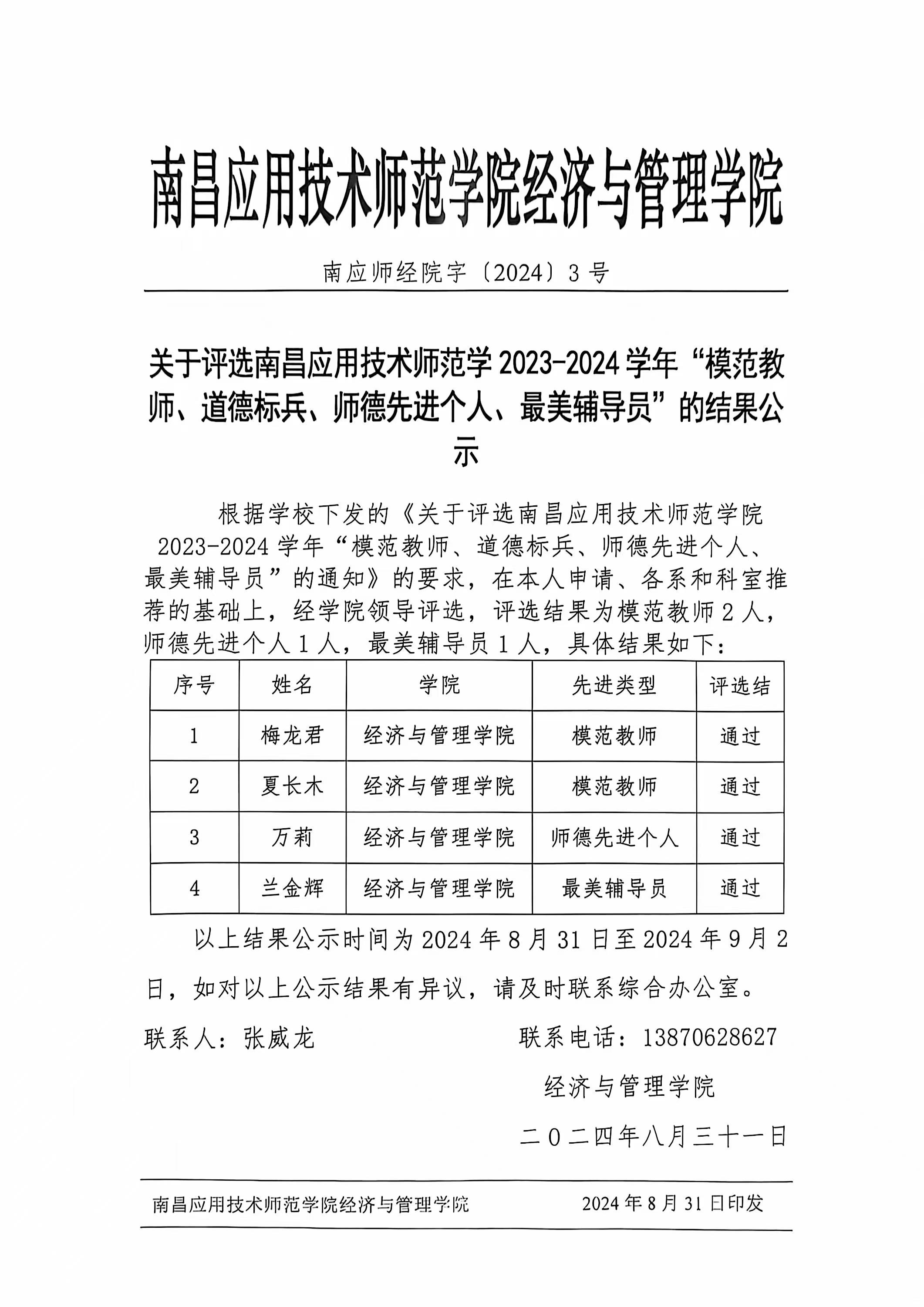 教学管理 学院新闻 学院公告 学科竞赛 您现在的位置是:首页 > 教学管理 > 学院公告 关于评选南昌应用技术师范学2023-2024学年“模范教师、道德标兵、师德先进个人、最美辅导员”的结果公示 管理员2024-08-312708 上一篇 beat365唯一官网召开新任干部任职宣布会