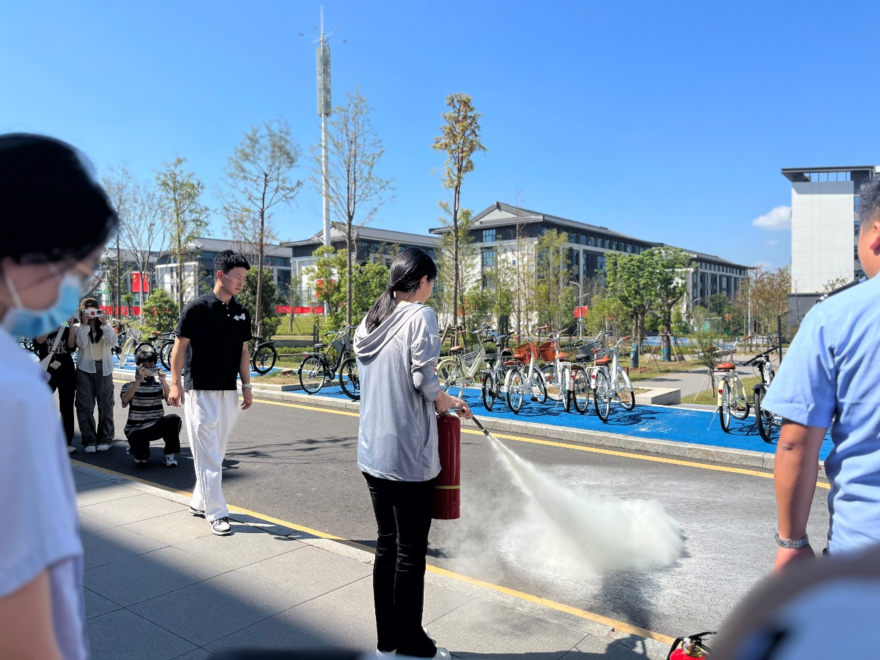 在演练的高潮部分,保卫处的老师们亲自上阵,为师生们演示灭火器和消防带的正确使用方法。他们动作娴熟,操作规范,每一个步骤都准确无误。在老师们的示范下,学生代表们也纷纷上台尝试使用灭火器灭火。通过实际操作,学生们更加深刻地掌握了灭火技能,增强了应对火灾的信心。