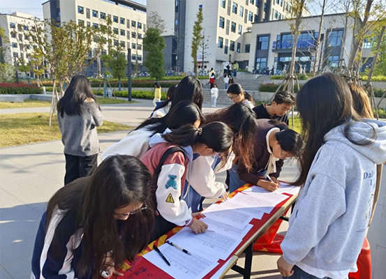活动现场热闹非凡,同学们热情高涨,如同熊熊燃烧的火焰。他们怀揣着对消防安全的深刻重视以及对生命的由衷敬畏,有序地在横幅上签下自己的名字。每一个签名都承载着一份庄重的承诺,那是大家对消防安全责任的担当和使命感的彰显。