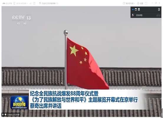 会上,全体党员集中观看抗战88周年纪念仪式和主题展览开幕式。通过回顾波澜壮阔的抗战历史,大家深切感受到当下和平生活的来之不易,并纷纷表示要以革命先辈为榜样,将这份爱国情、奋斗志融入到日常的学习和工作中,在新时代新征程上传承红色基因,牢记初心使命,以实际行动践行党员的责任和担当。