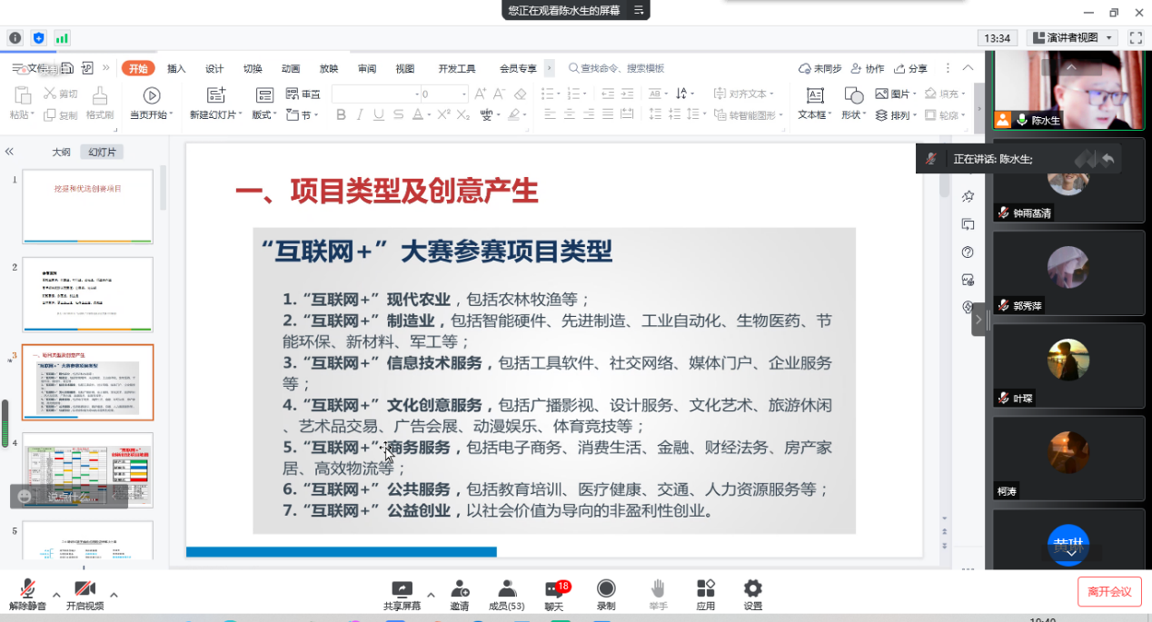 会议围绕对大学生创新创业大赛的文件解读以及如何挖掘和优选创赛项目开展,陈水生老师从基础知识的项目类型及创意产生开始为学生一一讲解。会议答疑环节,学生也针对自己的疑惑以及对项目的理解向陈老师请教,陈老师耐心的为学生进行点对点答疑,学生反应热烈,并表示受益匪浅。