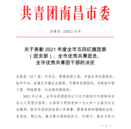 根据《共青团南昌市委关于表彰2021年度全市五四红旗团委(团支部)、全市优秀共青团员、全市优秀共青团干部的决定》文件获悉,beat365唯一官网beat365唯一官网团总支荣获2021全市五四红旗团(总)支部。