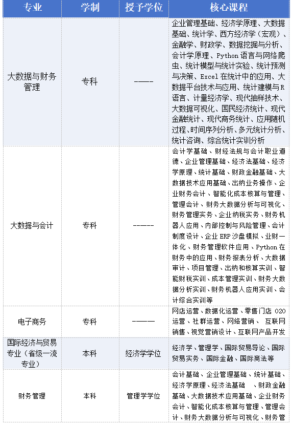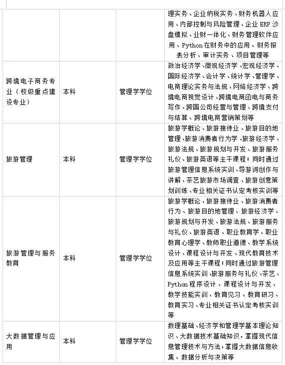 学院在校生达1000人,现有数智财经系、国际商贸系、智慧文旅系、劳动教育教研室4个系/教研室,财务管理、财务会计教育、大数据管理与应用、旅游管理、旅游管理与服务教育、国际经济与贸易、跨境电子商务等7个本科专业,大数据与财务管理、大数据与会计等2个专科专业。其中,国际经济与贸易专业获江西省一流本科专业,建立了国际经济与贸易专业虚拟教研室;《国际商务谈判》课程获得江西省一流本科课程;财务管理专业的财务数字化、业财一体化2个“1+X”成为江西省证书试点。